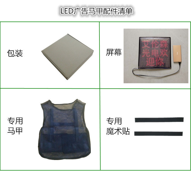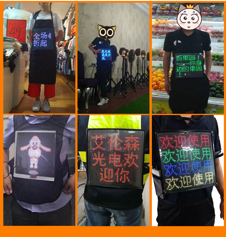 LED馬甲屏LED背心屏產(chǎn)品優(yōu)勢: 1.可隨時(shí)隨地發(fā)布內(nèi)容,立刻投入宣傳,商家精準(zhǔn)引流,擴(kuò)大廣告覆蓋范圍。 2.形式新穎,技術(shù)創(chuàng)新,大大提升瞬間曝光機(jī)會(huì),吸引顧客眼球,增加客流量。 3.可移動(dòng),可穿戴,就是行走中的廣告屏。圖片、文字、動(dòng)畫并茂,生動(dòng)鮮艷! 4.讓你成為傍晚人群密集區(qū)的明星,無需燈光和舞臺(tái),不說話也能萬人矚目,天越黑,你越亮!